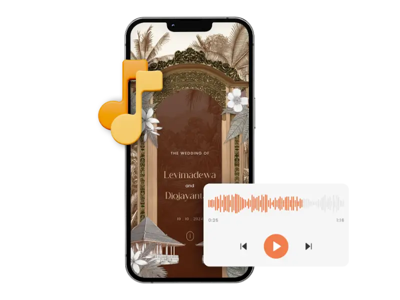 Beragam file musik yang kami sediakan, akan membantu mempercantik tampilan undangan Anda dengan tambahan audio latar pengiring yang akan berjalan otomatis* saat tombol buka undangan diklik.